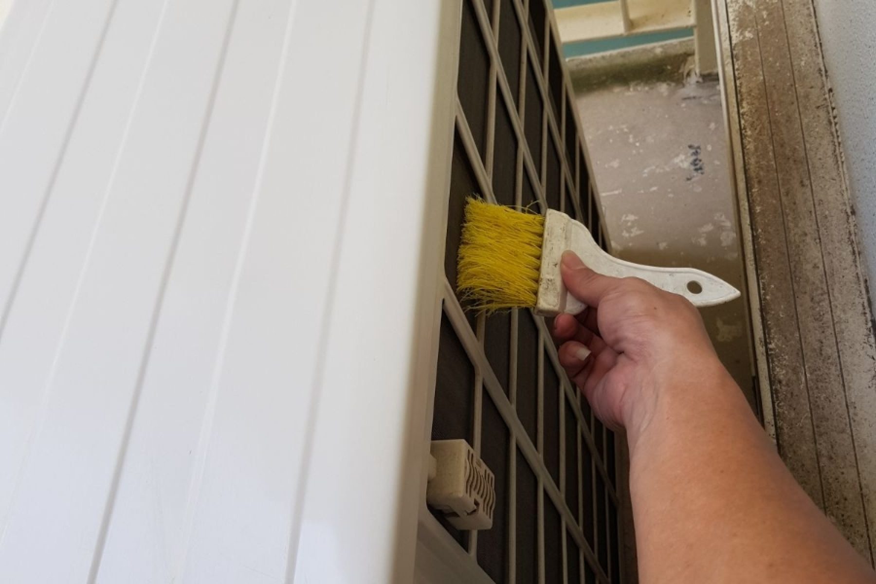 Cleaning front cover panel, air filters and water tray with germicide detergent.